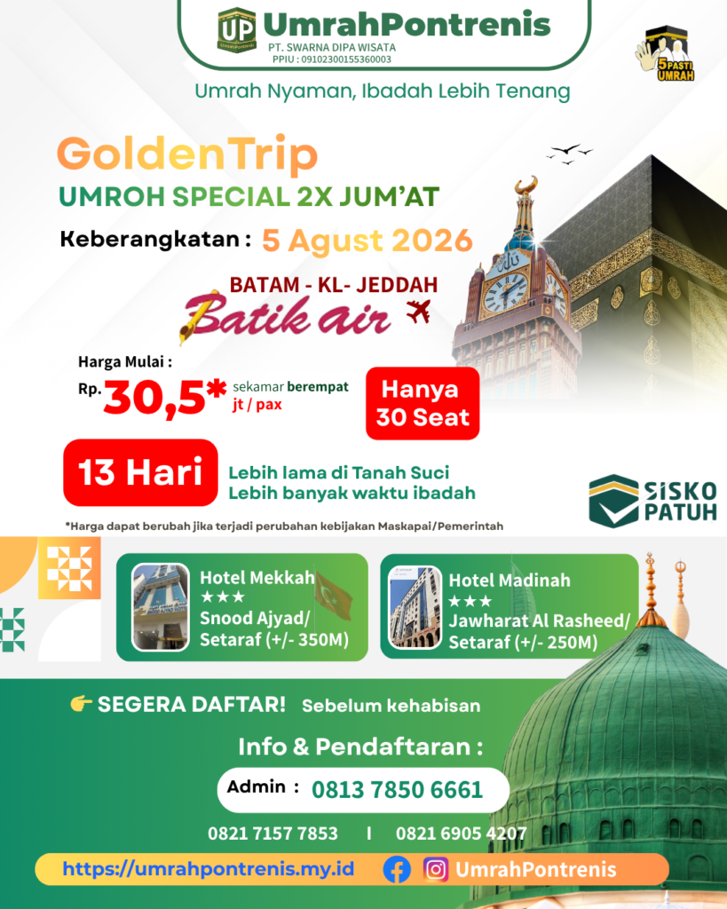 Dengan UmrahPontrenis : Umrah nyaman, Ibadah Lebih Tenang, yuk daftar sekarang...